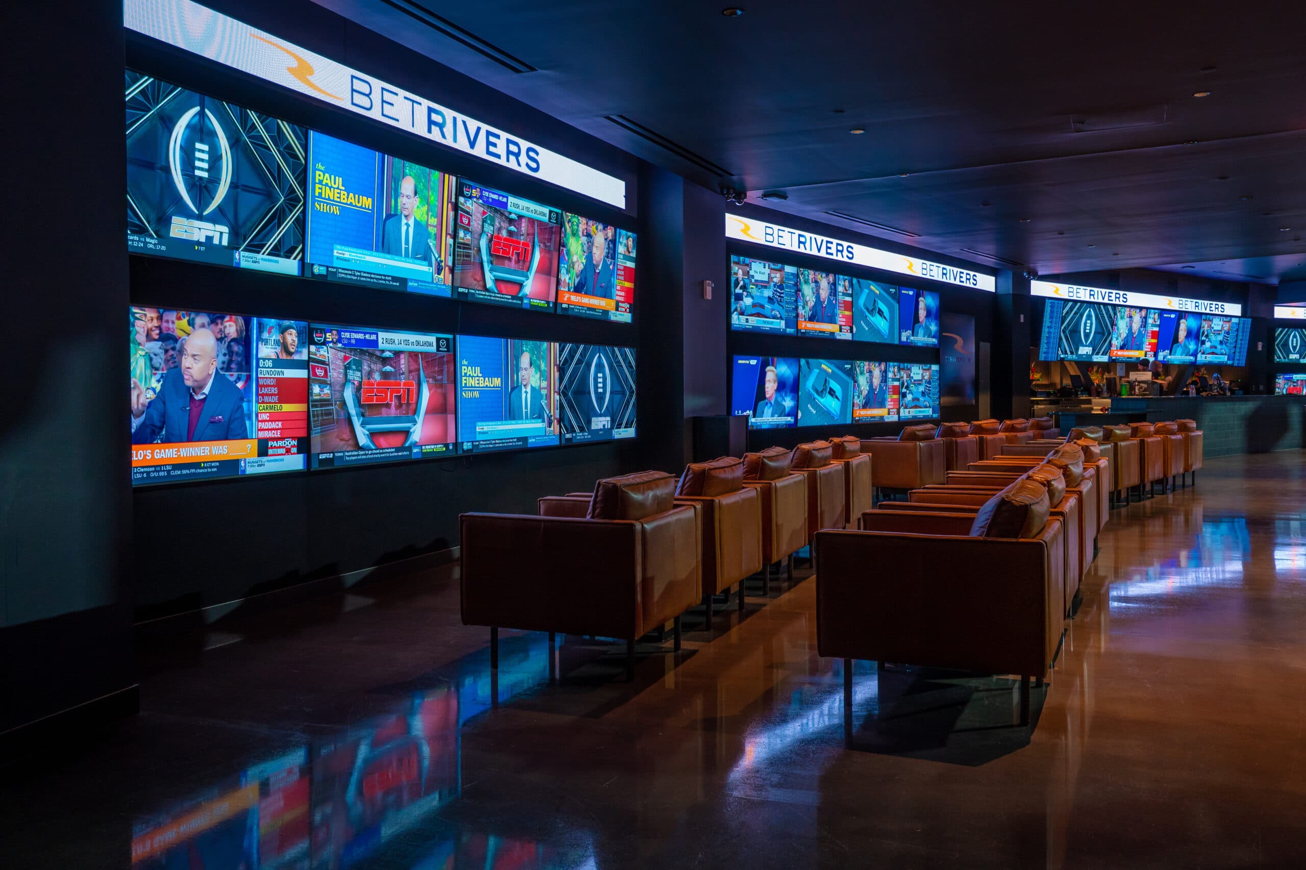 The New City Terrace combines the Spirit of '76 with contemporary designs, offering unique, vast spaces for socializing and semi-private experiences, including exclusive dining and premium amenities from lounge-style seats with top views. Additionally, the 6,500 sq ft BetRivers.com Sports Lounge includes club chairs, varied seating, and a 22x8 ft LED video wall for live action viewing, enhancing the arena experience with its dedicated area.